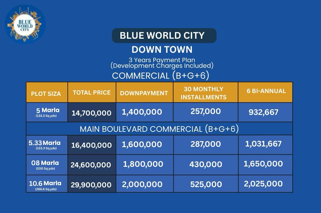 Blue World City Downtown Main Boulevard Commercial Marla Plots