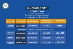 The Blue World City Downtown Sector A Payment Plan has a viable three-year low-down arrangement for serious investors. The buyers who prefer to own premium plots with manageable installments are planning to undertake this plan through the management of Blue World City.